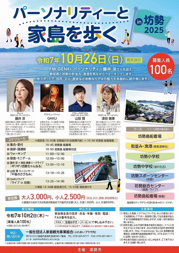FM GENKIパーソナリティ 藤井 涼さん、津田 晴香さんと一緒に秋の坊勢を歩く「パーソナリティと家島を歩く in 坊勢 2025」(主催:姫路市)が10月26日(日)に開催されます。 坊勢の町並みや漁港を見ながら、各スポットで自然・文化・歴史など島ならではの魅力をご紹介します。 申込みは、家島観光事業組合(☎079-325-8777)までお願いします。 家島観光事業組合HP https://h-ieshima.jp/